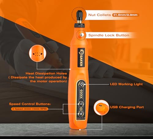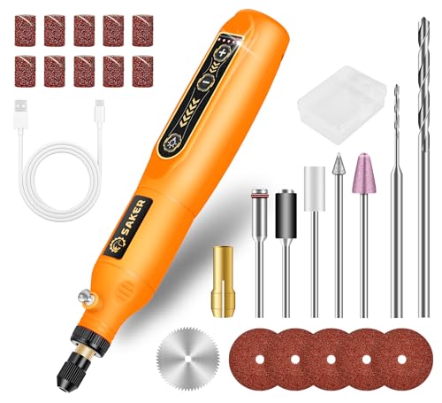 Unleash your creativity with the Saker Mini Rotary Tool Kit! Cordless, 5-speed versatility for precise engraving, sanding, grinding, and crafting. Compact 3.7V power tool perfect for DIY enthusiasts and hobbyists.