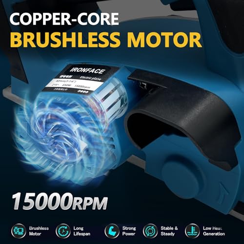The first thing that jumped out during our testing was the 15,000 RPM motor speed. That’s genuinely impressive for a third-party tool, putting it on par with premium planers we’ve used. The brushless motor design means less maintenance and better battery efficiency—we got through an entire day of trim work on two 4.0Ah Dewalt batteries, which is exactly what we’d expect from a comparable name-brand tool.