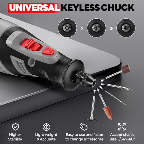 - Chuck Type: Keyless quick-change system (accepts 1/8″ shank accessories standard in the industry)