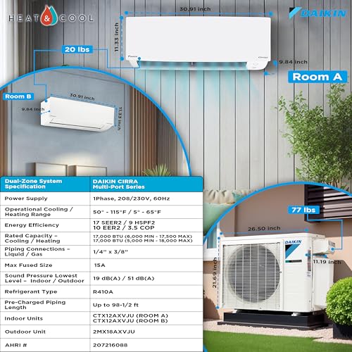 Upgrade your home’s comfort with Daikin’s CIRRA 2-Zone Mini Split Heat Pump. Delivering 24,000 BTU for dual independent zones, enjoy personalized heating and cooling. Includes Maxwell 15 ft. installation kit and wall bracket for easy setup. Experience energy-efficient, quiet, and reliable climate control.