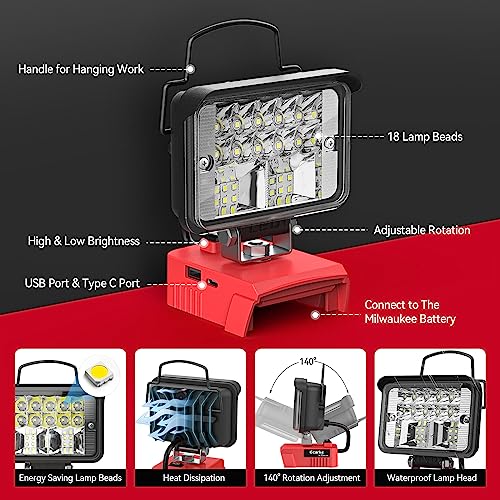 Powerful 20W LED work light compatible with Milwaukee m18 batteries. Ultra-bright 2000LM illumination for professionals and outdoor enthusiasts. Portable, versatile tool perfect for camping, fishing, hunting, and challenging work environments.