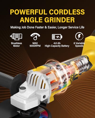 Unleash powerful performance with this 4.0Ah cordless angle grinder. Featuring 6 variable speeds, LED light, and compatibility with DeWalt 20V batteries, it’s your go-to tool for cutting, grinding, and polishing with precision and ease.
