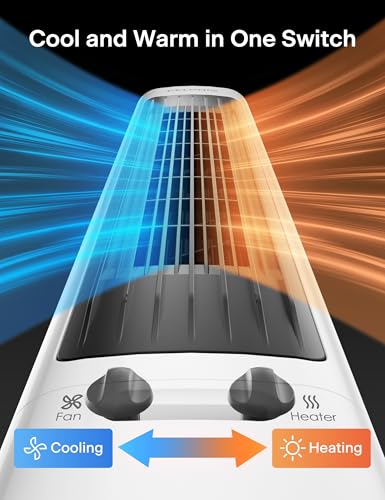 Year-round comfort in one space-saving tower. Oscillating fan with 3 speeds cools in summer, dual heating modes warm in winter. Remote control, 12-hour timer, and safety shutoff included.