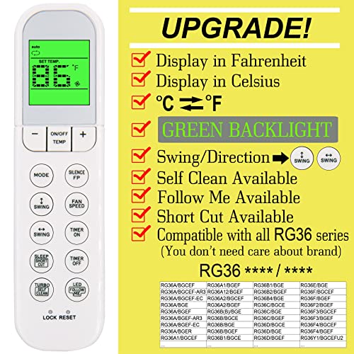 Replacement Remote Control for Midea ComfortStar FrigidaireAC Cooper&Hunter AC Air Conditioner RG36B/BGE RG36F/BGEF RG36A/BGEF-AR3 RG36B/BGCE RG36Y1/BGCEFU2 RG36F1/BGEFU1 (20190506271)