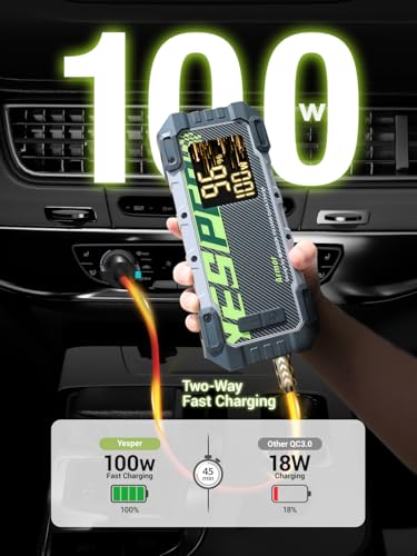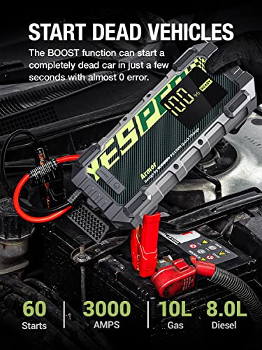 Never get stranded again with the YESPER Car Jump Starter! Powerful 3000A peak, charges fast, and revives engines up to 10.0L gas or 8.0L diesel. Compact, portable lifesaver with 100W charging and 60X jump capability.